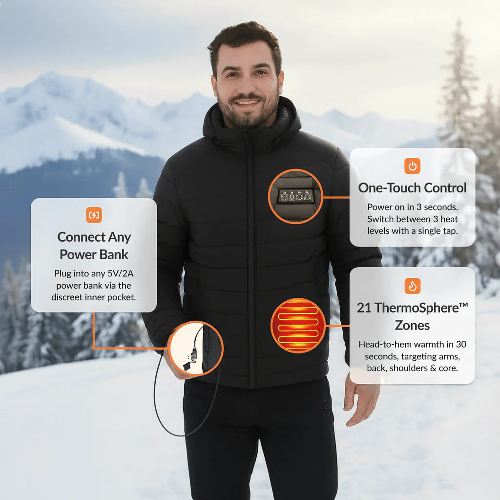 Our jacket uses built-in carbon fiber heating elements that warm up in just 5 seconds. Simply connect the included USB rechargeable power bank, press the button, and choose from 3 heat levels (Low / Medium / High) for your perfect temperature.